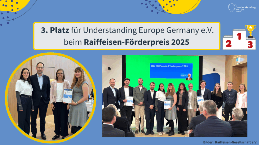 Der Preis zeichnet Projekte und Ideen von jungen Menschen aus, die das gesellschaftliche Miteinander fördern und Regionen zukunftsfähig und nachhaltig gestalten. Im Rahmen der Preisverleihung konnten wir unsere Arbeit von Understanding Europe Germany e.V. vorstellen und bedanken uns bei der Raiffeisen-Gesellschaft für die Auszeichnung. Wir freuen uns sehr, dass unsere Arbeit zur politischen Jugendbildung und unser Engagement so wertgeschätzt werden.